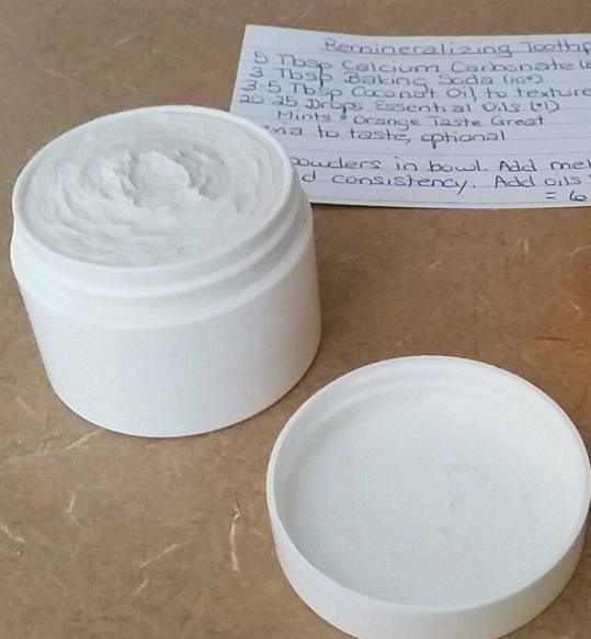 Mix powders together in bowl. Melt oil in sunlight or in double-boiler). Add melted oil to desired consistency. Add essential oils and stevia to taste. Place in jar. Average Cost = $2.80 / 3 oz. IMPORTANT NOTE: Spit oil-based toothpastes into the trash after brushing your teeth as they cause problems for pipes and septic systems.